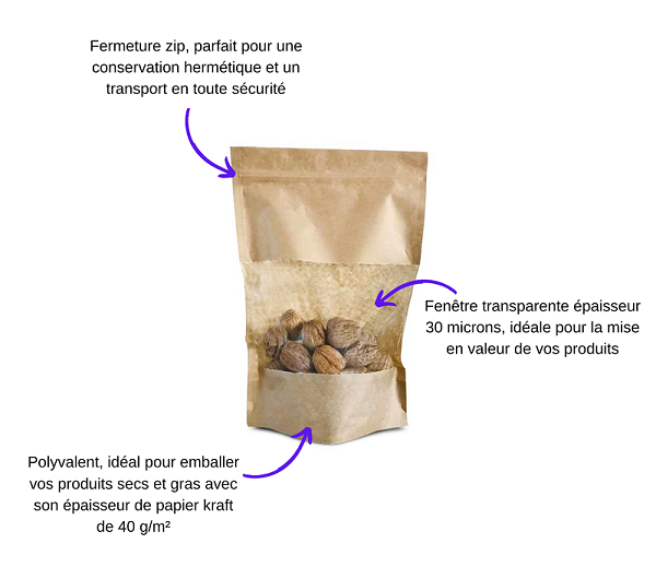 La gamme de sachets Doypack kraft est idéale pour emballer, transporter et conserver vos aliments secs, et même vos aliments gras. Grâce à sa fermeture en zip, vous pouvez refermer et conserver le sachet hermétiquement. Cet emballage kraft sera votre nouvel allié pour emballer et protéger vos fruits à coque, vos grains de café, vos feuilles de thé ou encore tous vos produits en vrac.