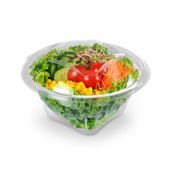 Ce bol salade 750 ml en PET est recommandé pour les professionnels de la restauration rapide et de la boulangerie. Soigneusement disposé dans vos vitrines, il permet de visualiser les préparations froides que vous vendez. Ce bol salade est également totalement hermétique puisqu'il est muni d'un couvercle intégré déchirable pour une grande simplicité d'utilisation. Aucun risque que la vinaigrette ou la sauce salade ne s'échappe. Pour un gain de place en réserve de restaurant, il est empilable. Vous pouvez munir ces boites salade en plastique d'un kit couverts en sachet très apprécié des clients qui déjeunent sur le pouce.