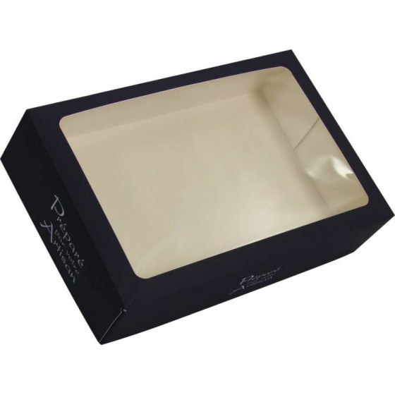 Cette boîte traiteur noire 30 x 21 x 8 cm "votre artisan" comporte une fenêtre transparente centré sur le couvercle. Cette dernière est particulièrement appréciée car elle permet de voir les préparations à l'intérieur sans avoir à ouvrir la boite. Ceci est par conséquent très pratique pour présenter vos pâtisseries à votre clientèle.