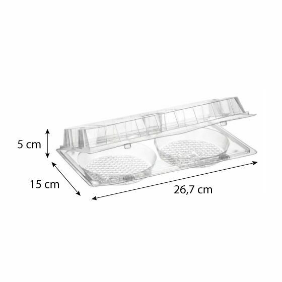 Fabriquée en plastique APET durable, cette boîte cristal alvéolée est spécialement conçue pour contenir deux tartelettes. Son couvercle à charnière assure une fermeture sécurisée grâce à un bouton-pression, garantissant la fraîcheur de vos créations tout au long de leur transport. Les dimensions généreuses de 26,7 cm x 15 cm x 5 cm offrent amplement d'espace pour des tartelettes variées.