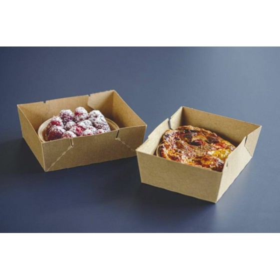 La barquette avec couvercle 17 x 12 cm est réalisée en carton de haute qualité, assurant une résistance optimale pour garantir la sécurité des plats pendant le transport. Son couvercle indépendant se fixe facilement, préservant la fraîcheur des aliments et évitant tout risque de renversement. La couleur brune ajoute une touche esthétique et naturelle, idéale pour des présentations élégantes.