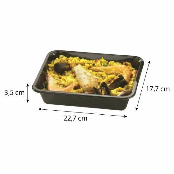 Avec des dimensions de 22,7 x 17,7 x 3,5 cm, ces barquettes offrent un espace généreux pour une variété d'aliments, des plats cuisinés aux produits frais. La capacité de 1000 ml les rend idéales pour une utilisation dans les traiteurs et les restaurants, offrant une solution polyvalente pour l'emballage de différents types de repas.